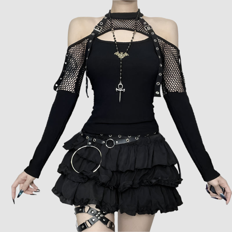 - Varrukad: Pikad, paljastatud õlgadega stiilseks aktsendiks.